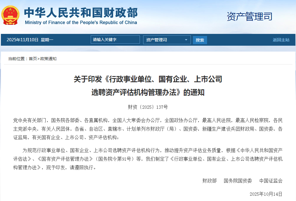 财政部、国务院国资委、中国证监会印发《行政事业单位、国有企业、上市公司选聘资产评估机构管理办法》